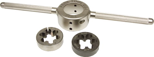 Przyrząd do gwintowania trzonów składający się z dwuramiennej oprawy, prowadnika #610 i 1" narzynki #606 wykonanej ze stali szybkotnącej. Odrębnie dostępny jest prowadnik #611 i narzynka #607 do gwintowania trzonów 1-1/8". Uwaga! Gwintowany trzon nie może być pokryty chromem