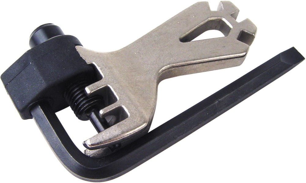 Mini wyciskacz do łańcucha. W zestawie klucz płaski, klucz imbusowy 5 mm, klucze do szprych 0,127"/0,130"/ 0,136". Waga: 80 g.