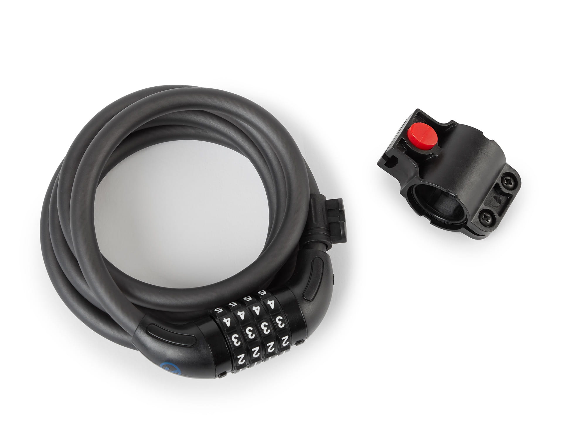 Zapięcie do roweru zabezpieczane za pomocą kodu. Gruby i bardzo gęsty stalowy splot zwiększa ochronę przed kradzieżą. Winylowa osłona dodatkowo zabezpiecza zapięcie przed działaniem niekorzystnych czynników zewnętrznych, ułatwia użytkowanie, a także chroni przed zarysowaniami roweru. Głowica zapięcia wyposażona została w dodatkowe blokady, odporne na podważanie.Zamknięcie następuje automatycznie po połączeniu obu części zamka. Aby ponownie go otworzyć, należy wprowadzić 4-cyfrowy kod. W komplecie znajduje się zapięcie oraz dodatkowy uchwyt pozwalający przymocować zapięcie do ramy w celu łatwiejszego transportu.