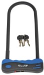 Zapięcie rowerowe. Pałąk o średnicy 12 mm wykonany z specjalnej hartowanej stali zabezpieczony gumą, co zapobiega zarysowaniu roweru. W komplecie 4 klucze. Wymiary: wewnętrzne – 108 mm x 258 mm, zewnętrzne – 165 mm x 320 mm. Waga: 897 g. Kolor: czarno-niebieskie.