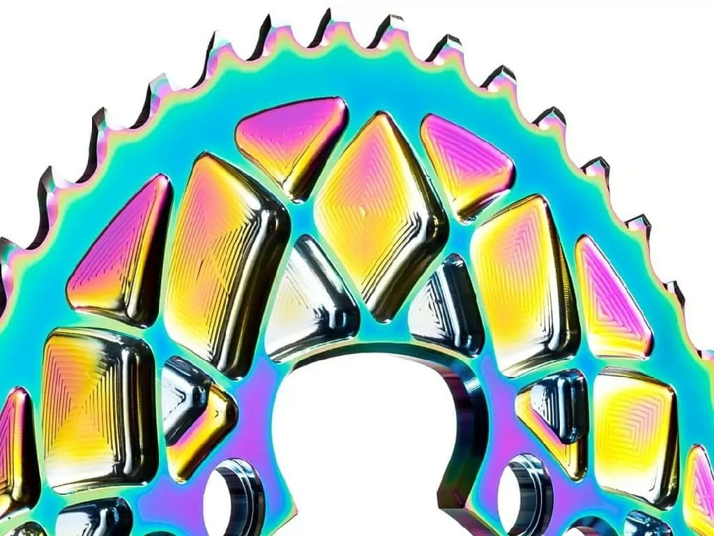 Specjalny proces powlekania PVD Rainbow Titanium sprawia, że powłoka zewnętrzna wnika w metal dużo głębiej niż w przypadku klasycznej anody co powoduje że zębatki są niewiarygodnie wręcz trwałe i wyjątkowo piękne.