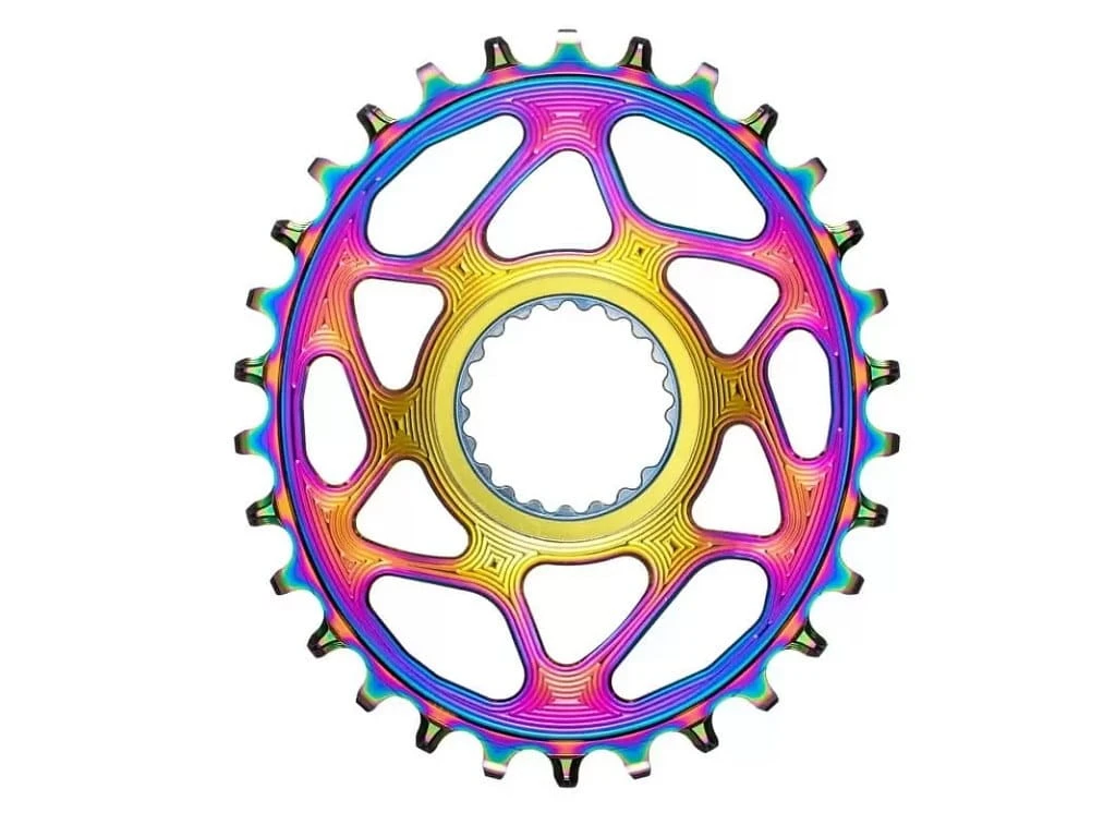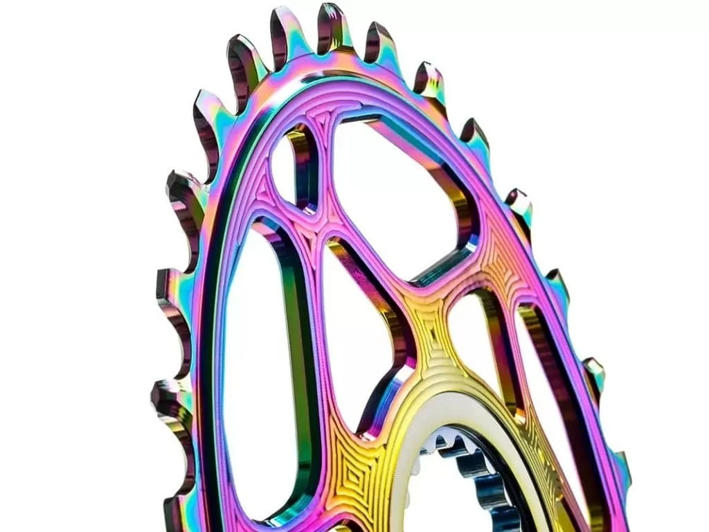 Specjalny proces powlekania PVD Rainbow Titanium sprawia, że powłoka zewnętrzna wnika w metal dużo głębiej niż w przypadku klasycznej anody co powoduje że zębatki są niewiarygodnie wręcz trwałe i wyjątkowo piękne.