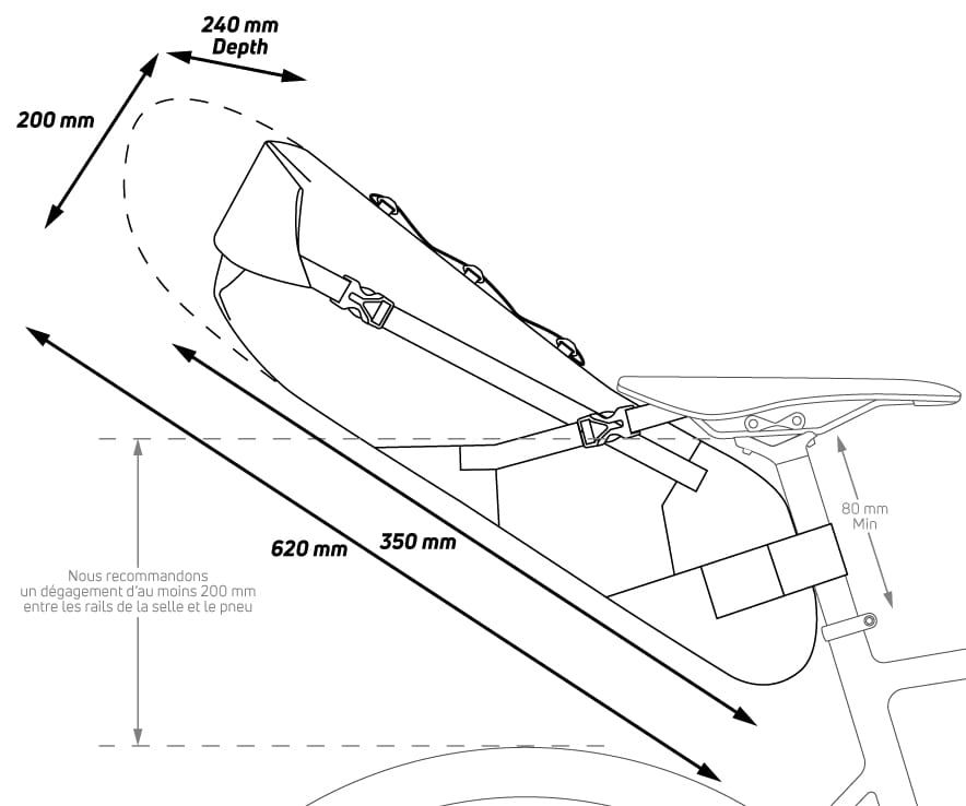 Jest to torba na siodło zaprojektowana do przewożenia dużej ilości przedmiotów bez potrzeby używania tylnego bagażnika. Wyposażona w kilka wytrzymałych samoprzylepnych pasków i materiał zapobiegający rozdzieraniu na podstawie, ta torba mocuje się do szyn siodełka i sztycy podsiodłowej, aby optymalnie rozłożyć ciężar na rowerze. Wyposażone w odblaskowe paski i pętlę mocującą do świateł, te torby siodłowe idealnie nadają się do przenoszenia lekkich, dużych przedmiotów, takich jak odzież. Składane zamknięcie i wodoodporny materiał z zgrzewanym wnętrzem mogą bezpiecznie przenosić cały sprzęt potrzebny na wycieczkę. Dostępny w dwóch rozmiarach 11 L i 17 L.