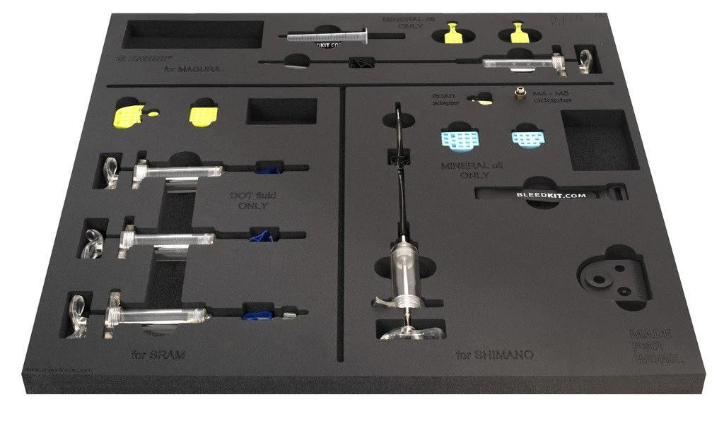 Atrybucja produktuTaca zawiera kompletny zestaw do odpowietrzania najpopularniejszych hamulców na rynku. Część zawierająca olej mineralny zawiera strzykawkę TPX ułatwiającą obsługę, oprócz wszystkiego do odpowietrzania wszystkich hamulców hydraulicznych Shimano, Magura, TRP i Tektro. Zestaw do odpowietrzania hamulców olejowych DOT zawiera strzykawki TPX ułatwiające obsługę, a także wszystko do odpowietrzania wszystkich hamulców hydraulicznych SRAM. Zestaw nie zawiera żadnych płynów.CZĘŚĆ OLEJU MINERALNEGO ZAWIERA:Końcówka dźwigni Przezroczysty lejek 30 ml (korpus strzykawki) z mosiężnym gwintem M5Korek gwintowany ze stali nierdzewnej (korek oleju) z wieszakiemKońcówka dźwigni Przezroczysty lejek typu Luer slip 20 ml (korpus strzykawki) do dźwigni Magura MTKońcówka zaciskowa Strzykawka TPX 20 ml z trwałą tubkąWkładka rurowa ze stali nierdzewnej zapewniająca prowadzenie pomiędzy rurką a złączką odpowietrzającąRura z mosiężną końcówką M6 do hamulców hydraulicznych Magura i TRP/TektroZaciski ułatwiające odpowietrzanie grawitacyjneAdapter mosiężny M5-M6 do hamulców hydraulicznych TRP/TektroAdapter mosiężny do hamulców hydraulicznych Shimano (Dura-Ace, Ultegra, 105, GRX, Tiagra)Podstawa pod lejek i adaptery z zapasowymi kołkami typu O-ring na doleBlok odpowietrzający do hamulców hydraulicznych Shimano Flat Bar (typu 2 lub 4 tłoczkowego). Nadaje się również do TRP/TektroBlok odpowietrzający do hamulców hydraulicznych Shimano z drążkiem dolnymBloki odpowietrzające do hamulców hydraulicznych Magura MTGumowany pasek z haczykiem i pętelką z jednej strony, 25 cm (do mocowania strzykawki zaciskowej do ramy lub widelca)Zapasowe O-ringi (5 szt.)kompatybilność:Zestaw ten jest kompatybilny z absolutnie wszystkimi hamulcami hydraulicznymi Shimano (XTR, XT, Saint, Zee, SLX, Deore, Alivio, Acera, Alfine, Metrea), w tym hamulcami hydraulicznymi Shimano szosowymi (Dura-Ace, Ultegra, 105, Tiagra, GRX) .Zestaw ten jest również kompatybilny ze wszystkimi hamulcami hydraulicznymi Magura MT oraz Tektro i TRP.ZESTAW DOT ZAWIERA:3 strzykawki TPX 20 mlZespół 2x M51x montaż krawędziZapasowe O-ringiBlok odpowietrzający do hamulców hydraulicznych starszego typu SRAM (typ 2 lub 4 tłokowy)Blok odpowietrzający do najnowszych hamulców hydraulicznych SRAMPrzydatne doZestaw ten jest kompatybilny z absolutnie wszystkimi hamulcami hydraulicznymi SRAM, w tym hamulcami hydraulicznymi 2017+ z portem odpowietrzającym Bleeding Edge. Kompatybilny również ze wszystkimi hamulcami hydraulicznymi Avid (Elixir, Juicy…) i wszystkimi starszymi hamulcami hydraulicznymi Formula (Oro, C1, R1, R0, K24, K18…). Niekompatybilne z hamulcami hydraulicznymi Formula Cura.